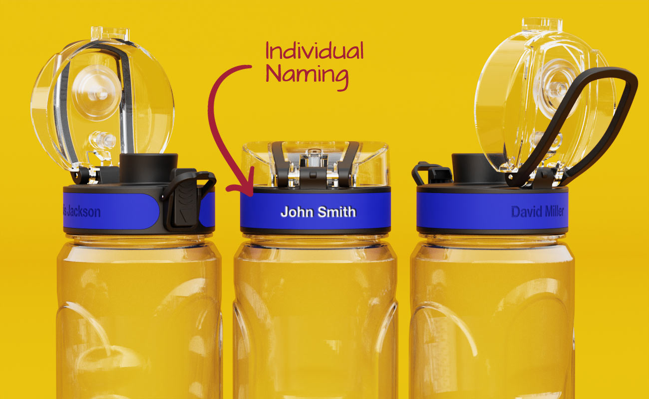 The engraving creates a completely indelible form of name marking. It's perfect for sports clubs and schools, avoiding any potential mix-ups of Water Bottles or Travel Cups during training or competition. Each unique name will accompany your logo and slogan on the Drinkware product.